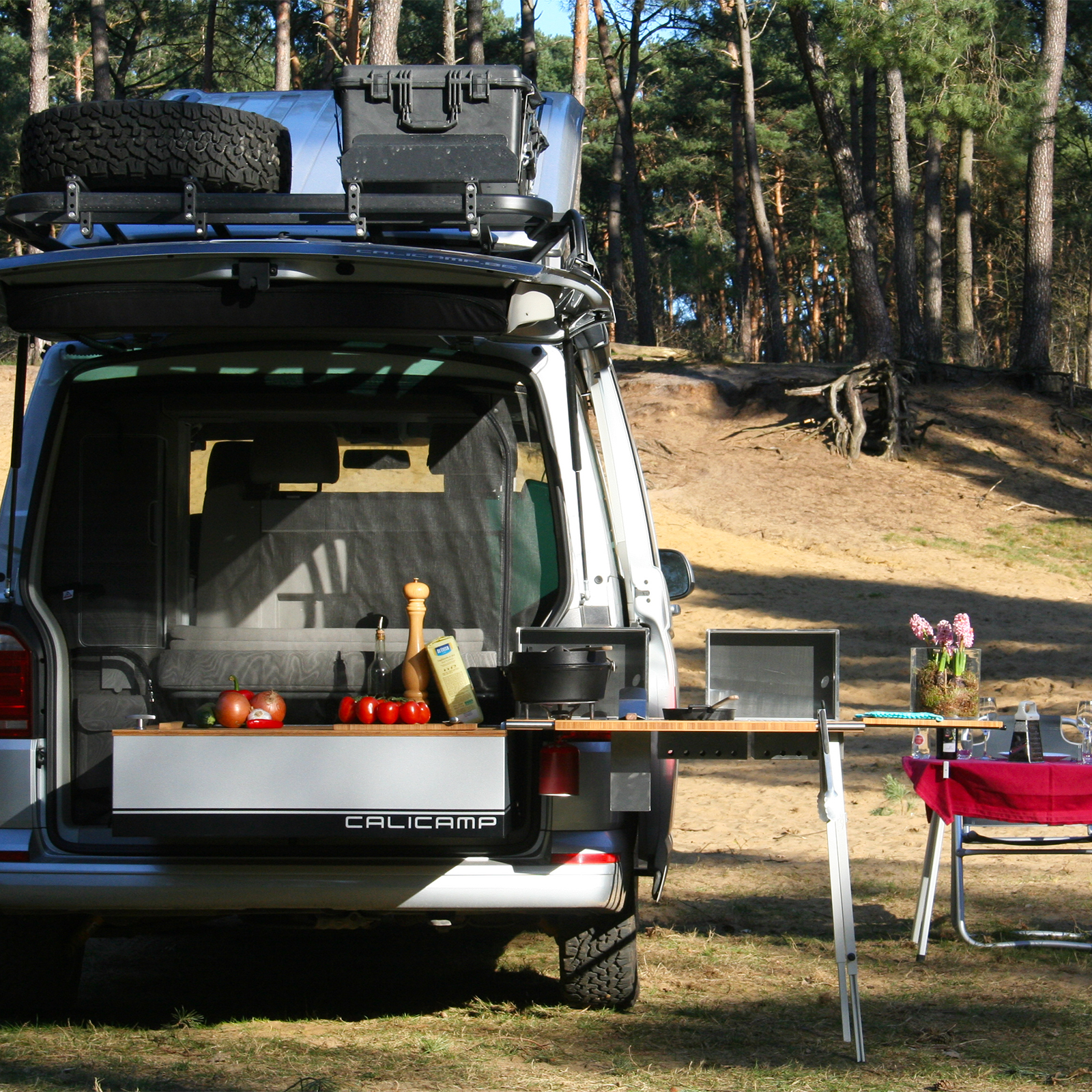 De Calicamp lade kan worden uitgebreid met een naar rechts of naar links vouwbaar keukenframe, verkrijgbaar in 2 lengtes (2½ en 3½ posities). Na het openvouwen kunnen er modulaire kookuitrustingen worden ingehangen al naargelang het menu van de dag. Verschillende combinaties van werkzones, gaspitten, spoeltafels, barbecues en ovens zijn mogelijk. De barbecue werkt op houtskool en kan worden gebruikt om te grillen, te roken, te stomen en te bakken. Een windscherm houdt de kookdampen en geuren buiten en beschermt de gasvlammen tegen de wind. Alle kookuitrusting past ingenieus in mekaar en neemt zeer weinig plaats in. De opbergruimte blijft toegankelijk tijdens het koken.